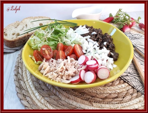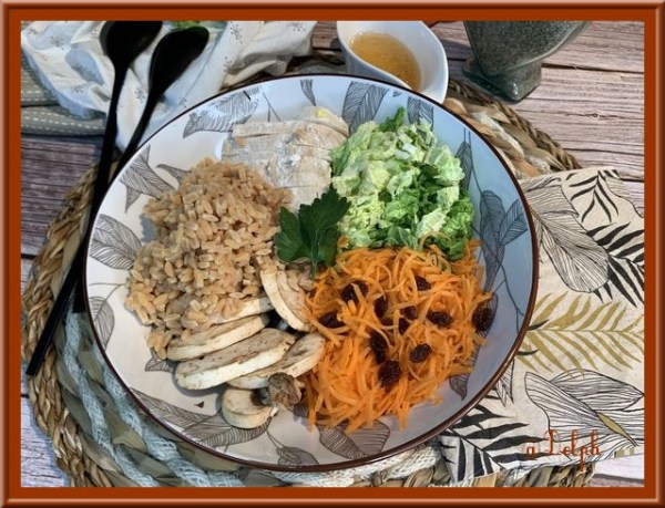 Voici un bowl avec tous les restes de la semaine, un peu de carotte, champignon, chou chinois et une escalope de poulet cuite et hop on se fait une petite salade rapide..C'est parfait pour moi. Si vous souhaitez un bowl végétarien, il ne faudra pas mettre le poulet. Ingrédients : Pour 1 personne 1 escalope... Lire la Suite →