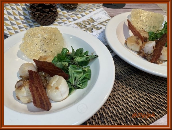 Poêlée de noix de Saint-Jacques, tuiles de parmesan et chips de poitrine fumée