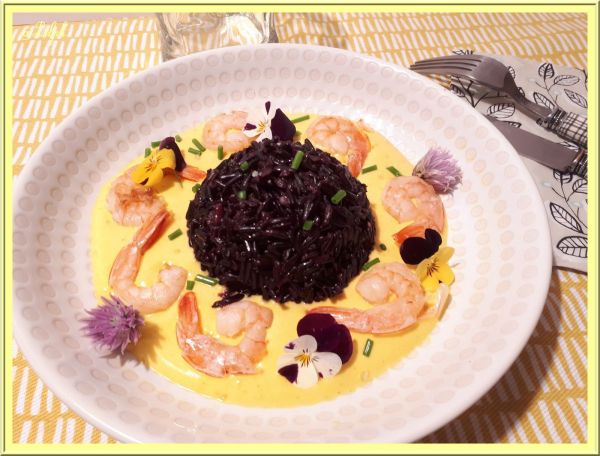 Riz noir aux crevettes, sauce au safran et curcuma