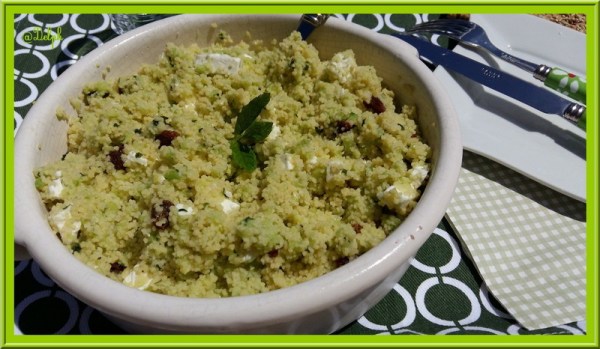 J'aime beaucoup le Taboulé et cette fois-ci j'ai décidé de changer du traditionnel, je ne regrette pas c'est un régal. Ingrédients : 250 g de semoule grain moyenle jus de 2 citrons1 concombre20 feuilles de menthe (en garder 1 ou 2 pour la décoration)3 c à s d'huile d'olive Terra Delyssa1 poignée de raisins secs100... Lire la Suite →