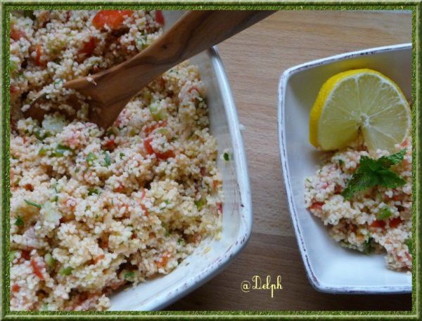 J'achète toujours mon taboulé, et pour une fois j'ai voulu tenter de le faire, je me suis inspirée de nombreuses recettes, j'ai enlevé certains ingrédients j'en ai rajouté d'autres....Alors voici mon taboulé maison.... Ingrédients : 200 g de semoule de couscous moyen2 grosses tomates bien mûres1 poivron rouge1/2 concombre1 oignonle jus d'1 citron2 cuillères à... Lire la Suite →