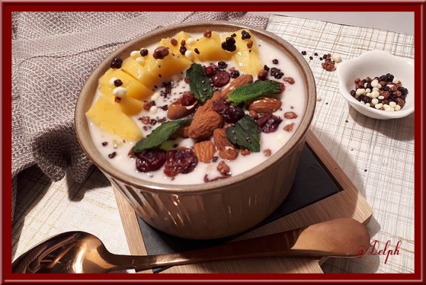 Une nouvelle idée pour un petit déjeuner sain qui vous calera jusqu'au repas du midi. Si vous n'aimez pas la mangue, vous pouvez mettre de l'ananas ou un autre fruit de saison. Ingrédients : Pour 1 bowl 60 g de flocons d'avoine25 cl de lait d'amande1 c à s de graine de chia Festifruits1/2 mangue1... Lire la Suite →