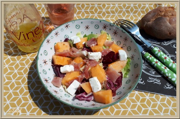 Une nouvelle salade fraîche et légère avec laquelle je me suis régalée. Le choix du melon est primordial dans cette salade, il faudra qu'il soit bien mûr et bien sucré. Ingrédients : Pour 1 assiette quelques feuilles de salade1/4 de melonfeta 2 tranches de jambon cru Pour la vinaigrette: 2 c à s de vinaigre... Lire la Suite →
