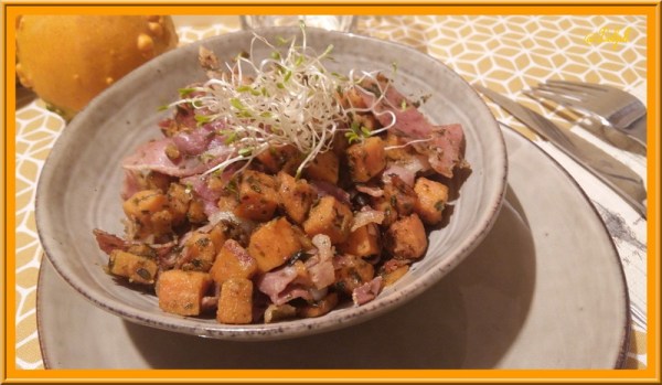Gratin de purée de butternut, patate douce au bacon et Comté