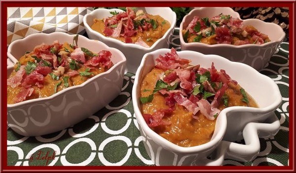 Voici une délicieuse purée qui change de la traditionnelle purée de pommes de terre. J'ai choisi de mettre de la poitrine fumée mais vous pouvez l'enlever si vous souhaitez accompagner une autre viande. Je l'ai réalisée avec mon Thermomix, mais vous pourrez faire de même en cuisant le tout dans une sauteuse puis mixer avec... Lire la Suite →
