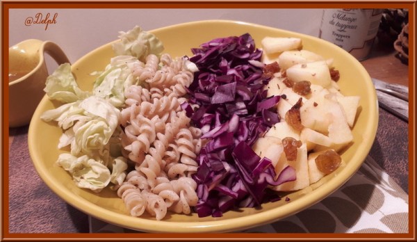 Voici comment se faire un petit repas facile avec un reste de chou rouge et de pâtes..C'est une petite salade toute fraîche et légère alliant le sucré et le salé. Pour faire le plein de vitamines c'est parfait. Ingrédients : (Pour 1 personne) 1/4 d'un petit chou rouge un poignée de salade icebergune dizaine de raisin sec... Lire la Suite →