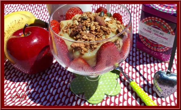Le matin j'aime me préparer des petits déjeuners variés, voici donc une idée que je vous partage, avec une compote que j'ai beaucoup aimée. Ingrédients: 430 g de rhubarbe1 banane 90 g2 pommes Jazz3 c à s de sucre canne1/2 c à c d'extrait de vanille.flocons d'avoines blochgranola aux fruits (mange tes graines)quelques fraises Préparation... Lire la Suite →