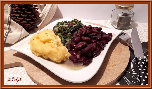 Nshima (Purée de farine de maïs, épinards et haricots rouges).