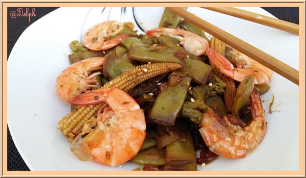 Wok de crevettes aux haricots mange-tout et petits maïs