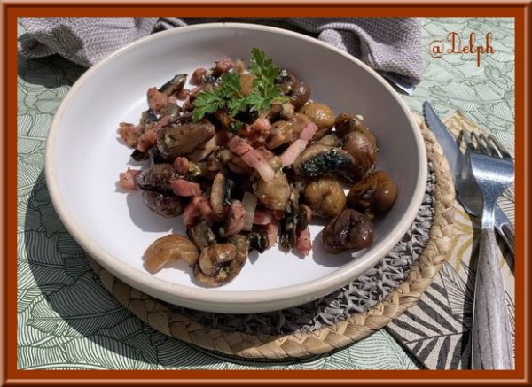 Voici une délicieuse poêlée qui nous a régalés. Rapide et simple d’exécution c'est un plat qui est parfait pour un repas du soir. Ingrédients : Pour 4 personnes 250 g de champignons bruns 10 g de beurre 1 gousse d'ail 4 brin de persil 200 g de lardons fumés 1 oignon 400 g de châtaignes... Lire la Suite →