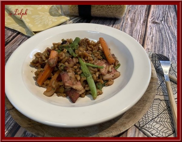 Coquillettes aux poireaux, et jambon râpé fumé au Cookéo