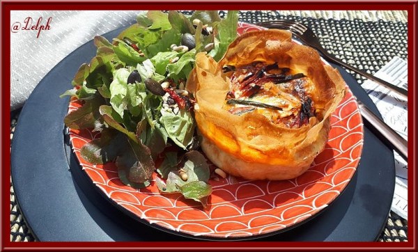 Voici une entrée délicieuse entrée ,accompagnée d'une salade elle est parfaite. Le fromage apporte de la gourmandise et les feuilles de brick du croustillant, nous avons beaucoup aimé. Vite préparé c'est parfait pour moi. Ingrédients : Pour 4 personnes (moule de 24,5 cm de diamètre) 6 feuilles de brick75 g de farine100 g d'emmental râpé100... Lire la Suite →