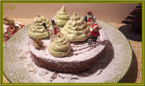 Gâteau au yaourt à la vanille, décoré de sapins de Noël meringués