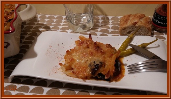 Gratin de macaronis à l’aubergine, lardons et piments basques