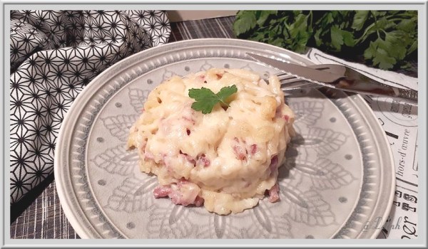Une petite recette de pâte rapide, et qui plaît toujours à mes fils. Pour cette recette il faudra prendre des pâtes à cuisson longue. Ingrédients : Pour 2/3 personnes 200 g de lardons250 g de macaroni180 g de crème liquide450 g d'eau90 g de lait2 jaunes d'oeufssel, poivre à ajouter en fonction des goûtsParmesan. Préparation... Lire la Suite →