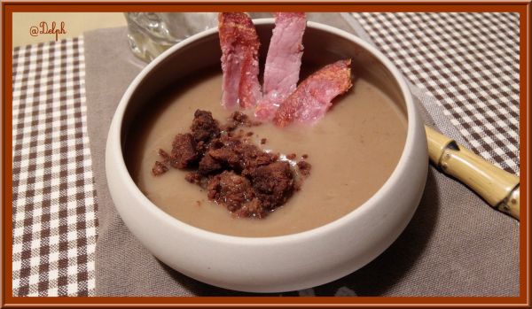 Velouté de pâtisson, marrons et chips de bacon