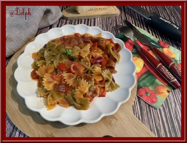 Un nouveau one pot très facile à réaliser, lorsque je n'ai pas trop le temps de cuisiner, j'opte pour ce genre de plat. Pratique et assez rapide on se régale simplement. Ingrédients : Pour 4 personnes 320 g de pâtes de type farfalle200 g de chorizo doux1 poivron rouge1 oignon rouge65 cl de bouillon de... Lire la Suite →