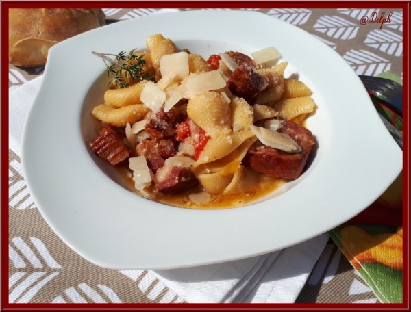 Voici un recette très simple que j'ai trouvée chez ma chère Elise du magnifique blog Yumélise..Une recette pour mes adolescents, des pâtes, du chorizo, sans légumes verts et les voilà heureux.. Ingrédients : (Pour 4 personnes) 400 g de pâtes Fusilli1 oignon1 chorizo entier 225 grammes fort, extra fort ou doux selon vos goûts50 cl de crème liquide entière35 cl d'eau2 carrés futés tomate poivron ou... Lire la Suite →