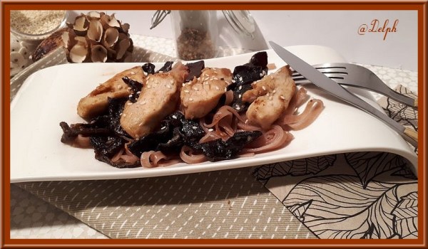 Filets de poulet aux champignons noirs et tagliatelles de riz